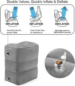 EASY TO INFLATE AND DEFLATE: Quick air valve which makes the airplane foot rest remarkably easy to inflate and deflate, so making it super easy to set up or pack them up quickly and be on your way.
